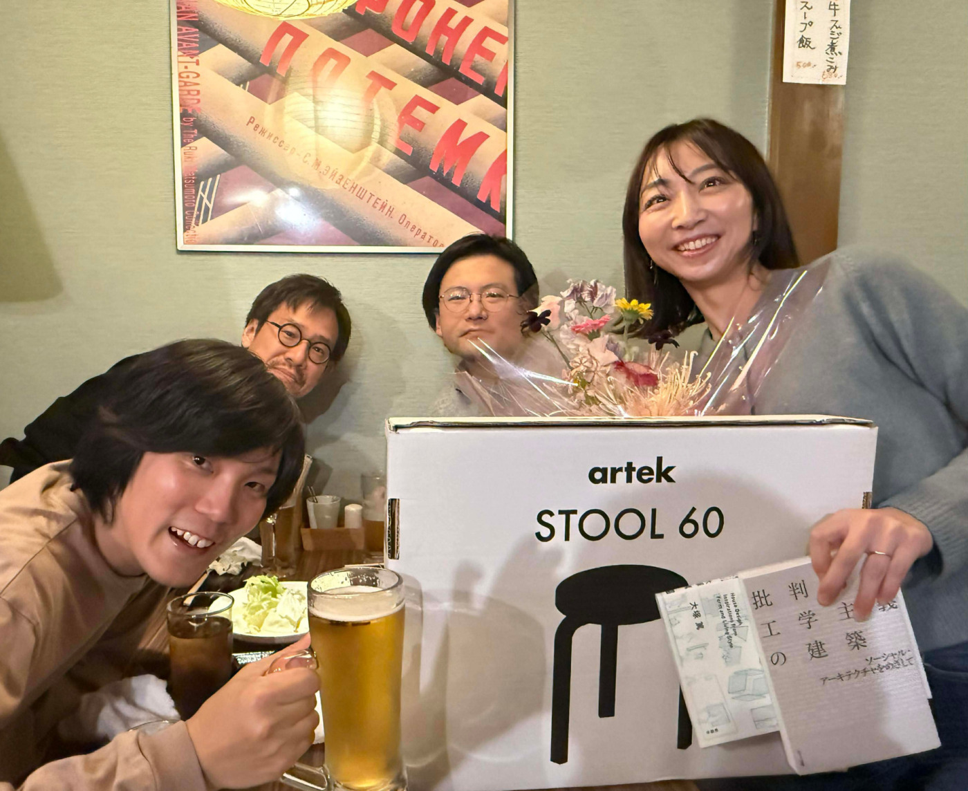 少し時間が空きましたが、3年半勤めていただいた橋本さんが退所し新たな道に進むこととなりました。人当たりや語学、機転の良さに優れ、文系大学出身というハンデを抱えながらも建築の世界でよくがんばっていたように思います。特にCGパースの成長は目を見張るものがあり、業務でもたくさん助けていただきました。昨年末に壮行会を開き、すでに独立して福岡と大分でそれぞれ活躍をしているOBの田中くん(田中篤美建築設計事務所)、室くん(室宏アトリエ)の二人にも駆けつけていただき、ささやかながらみんなでお祝いをさせていただきました。ちなみにお店は彼女のリクエストで焼き鳥屋に。