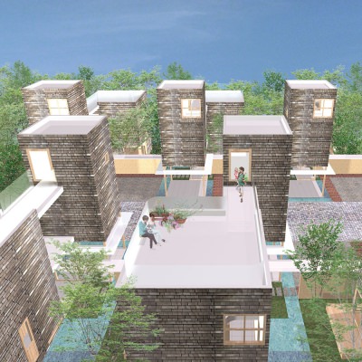 敷地周囲にはクヌギをはじめとした雑木林が生い茂り、その中に築年数や様式の異なる2棟の平屋住戸および倉庫が各々独立して建っていた。このうち既存住戸をそれぞれ診療スペースと院内カフェに改修し、双方をオープンエアーな屋内として繋ぐことで内外連続するホールを増築した。居心地の良いリビングの様なホールは風除室であると同時に、待合、プレイルーム、ワークショップやコンサート会場、近所の寄合などその用途は千変万化する。また、季節の良い日に特注の木製引戸を開放すれば、ほとんど屋外のような空間にもなる。このように、ホールは特定の機能や用途を持たず、隣接する具体的な用途を持つ居場所との間にゆるやかな関係性を築く”触媒”として存在する。