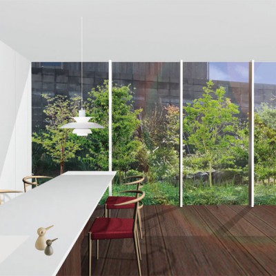 母屋は、コストを考慮しモジュールによる単純な矩形ボリュームとしたが、不整形な境界壁によって生まれるいくつもの「隙間=庭」によって内部では多様な広がりが生まれ、矩形プランでありながらも変化に富む豊かな内部空間が実現できた。