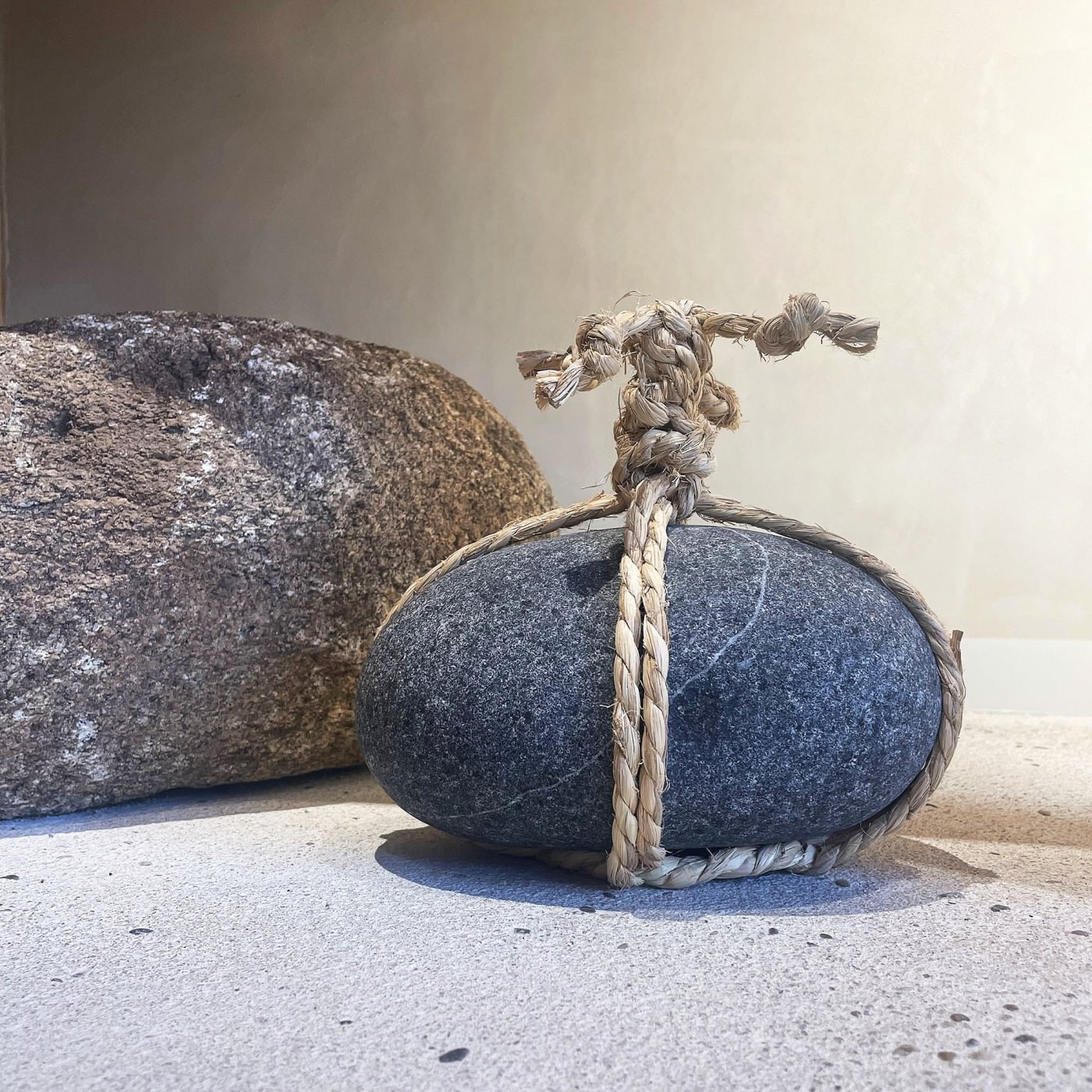 関守石には出来合い品もあるが流通量が非常に少なく、既存内装との調和や使い勝手、存在感や視認性など相応しいバランスのものを探し当てるのが困難である為、オリジナルで製作することとした。石の産地やサイズ感、縄の選定等にこだわり、日本海沿岸にて永い年月の間自然に削られ滑らかに丸みを帯びた石を、神事などでも使われる国産の藁縄(わらなわ)で結んでいる。大きさは、女性ひとりで無理なく持てる範囲で通常の関守石よりもかなり大きめとし、縄は一般的に使用される棕櫚縄(しゅろなわ)ではなく、あえて太く粗野な藁縄を用いることで、伝統的なスタイルとしつつもそれを僅かに崩した独特な存在感となるように考えた。自然石の調達と編込をishimusubishi氏に依頼し、実現させることができた。