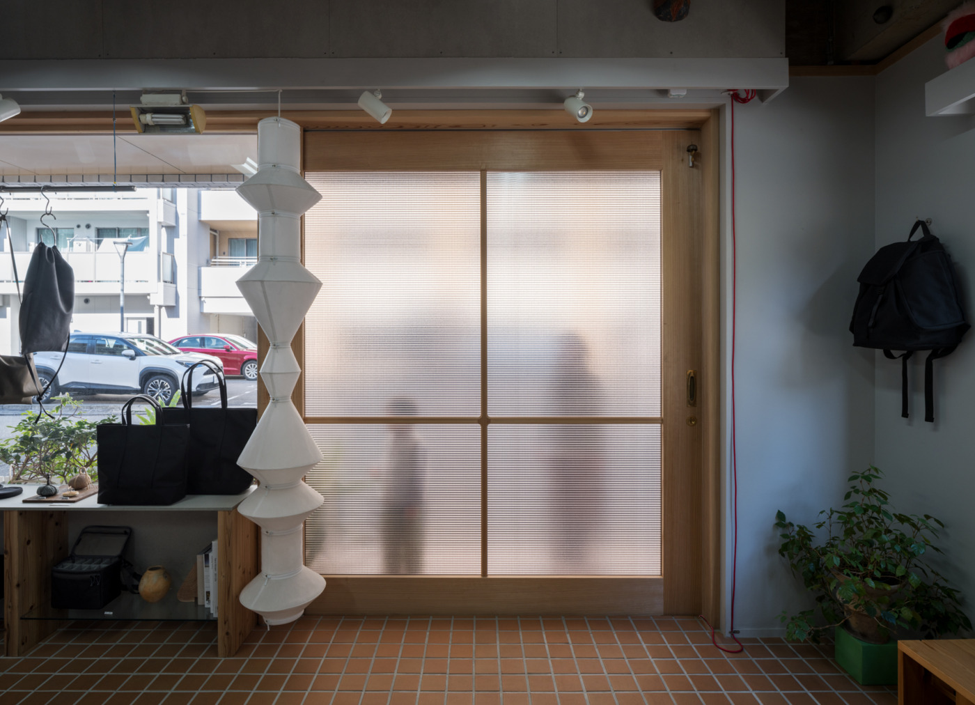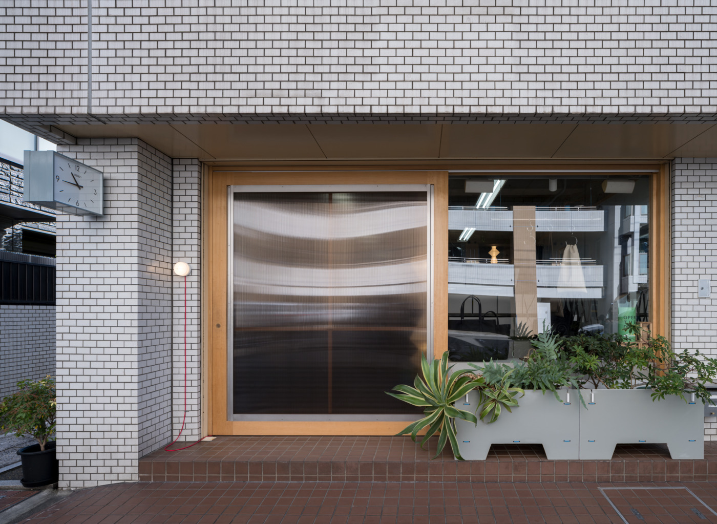 さらに、商品ディスプレイを兼ねたショーウィンドウに続き、残りのファサード全体を覆うように一枚引きの大きな木製框引戸を設計し、印象的な店舗ファサード(②)を構成した。面材にはあえて半透明素材を採用することで、店内に光と気配を柔らかく取り込み、来店客が落ち着いて過ごせる環境にも配慮している。この面材は、厚みの異なるブラウンとクリアの中空ポリカーボネート板を90度回転させて重ね合わせたもので、風景をわずかに歪めながら映し込むホログラムのような効果を生み、眺める角度や時間によって表情が刻々と移ろう。(なお、この実験的なアイデアは、2020年竣工の住宅「西福間の境界」で採用した建具の発展型である)